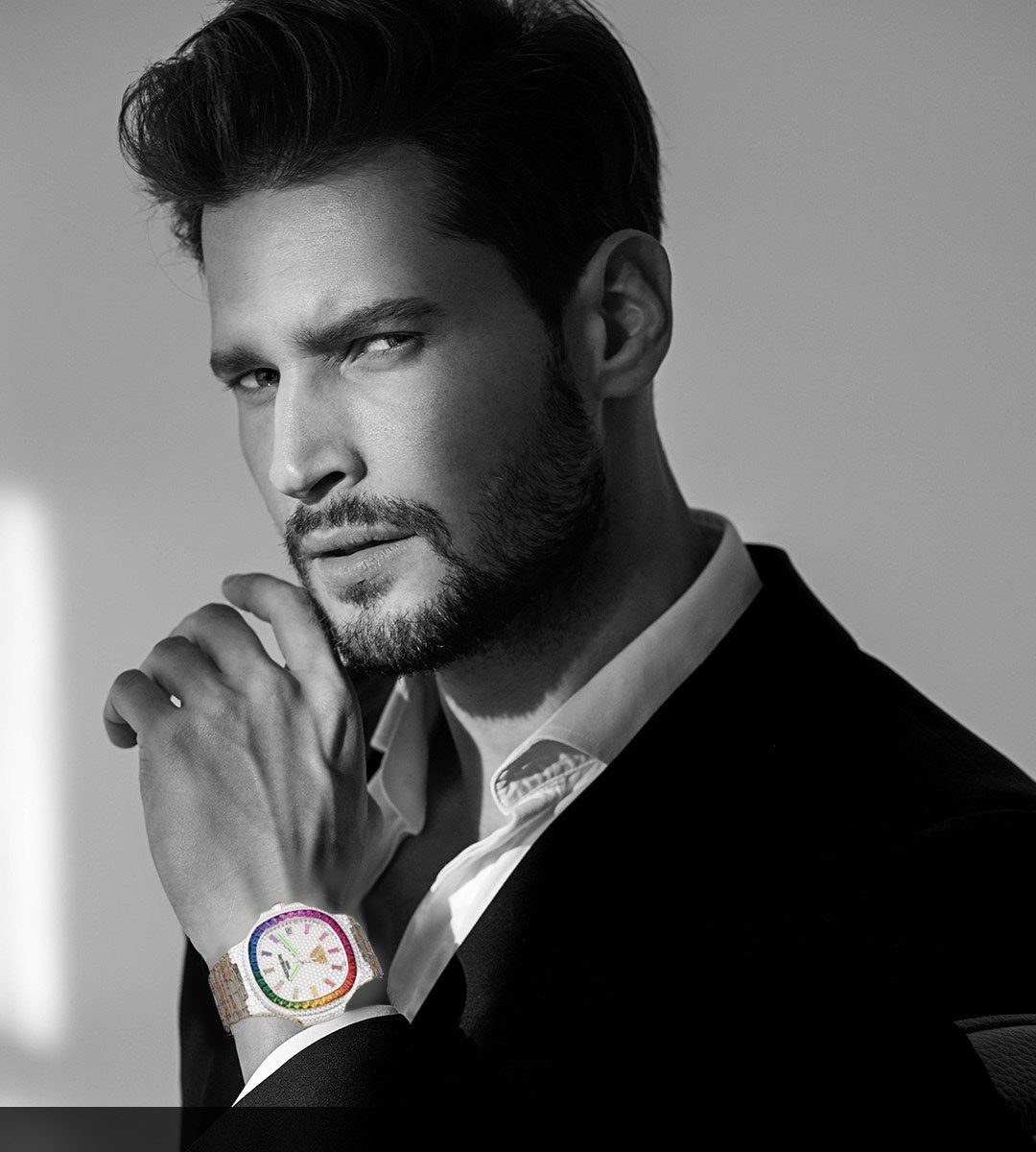 8.5 grams of exquisite 18-karat gold — available in yellow, white or rose — enhanced by a vibrant halo of rainbow-hued precious stones.